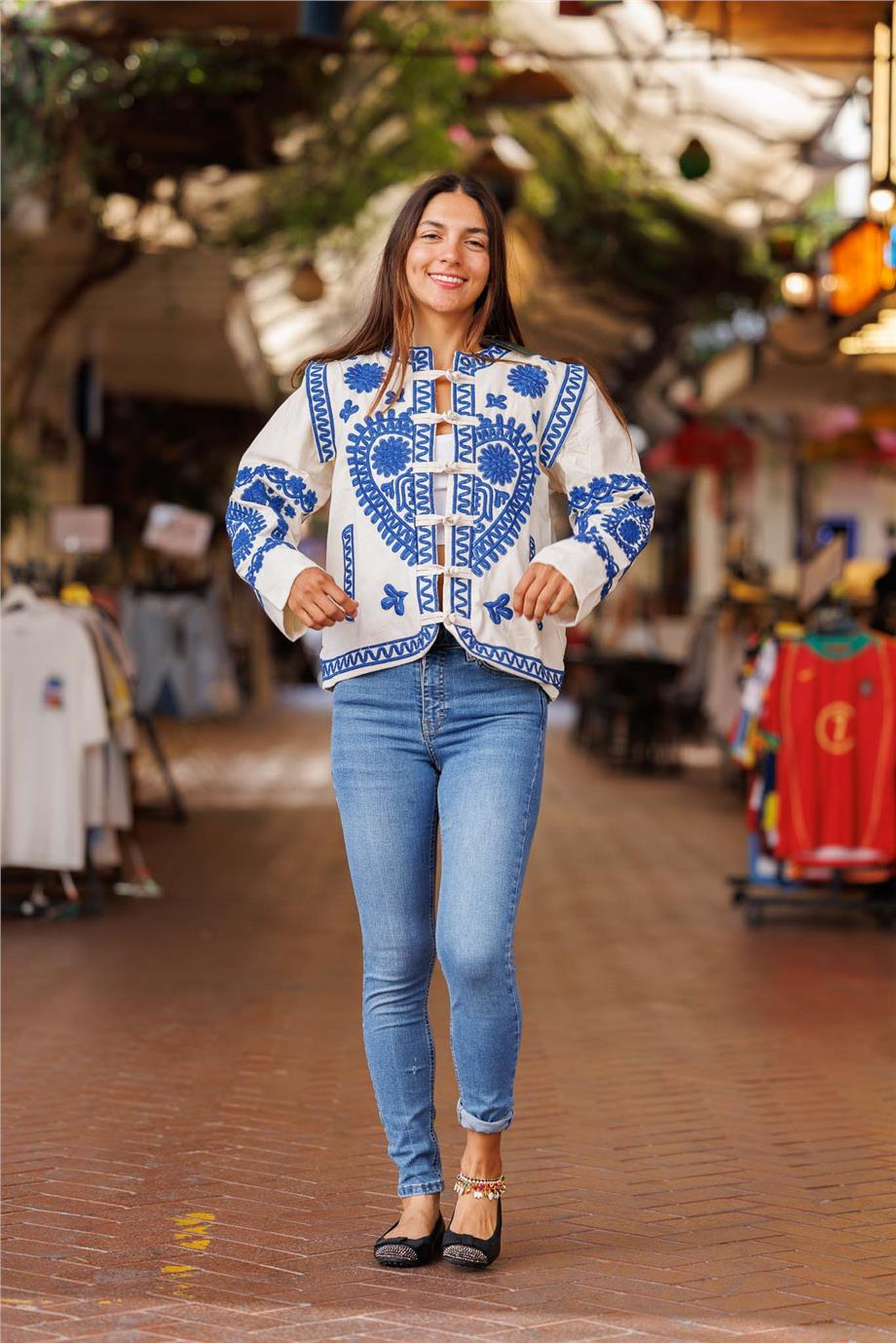 🤍🧥 Krem Rengi İşlemeli Düğüm Düğmeli Ceket