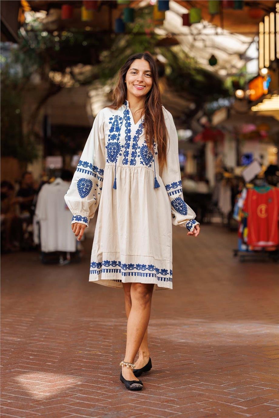 Krem Rengi V Yaka Ham Keten Nakışlı Elbise (2899)