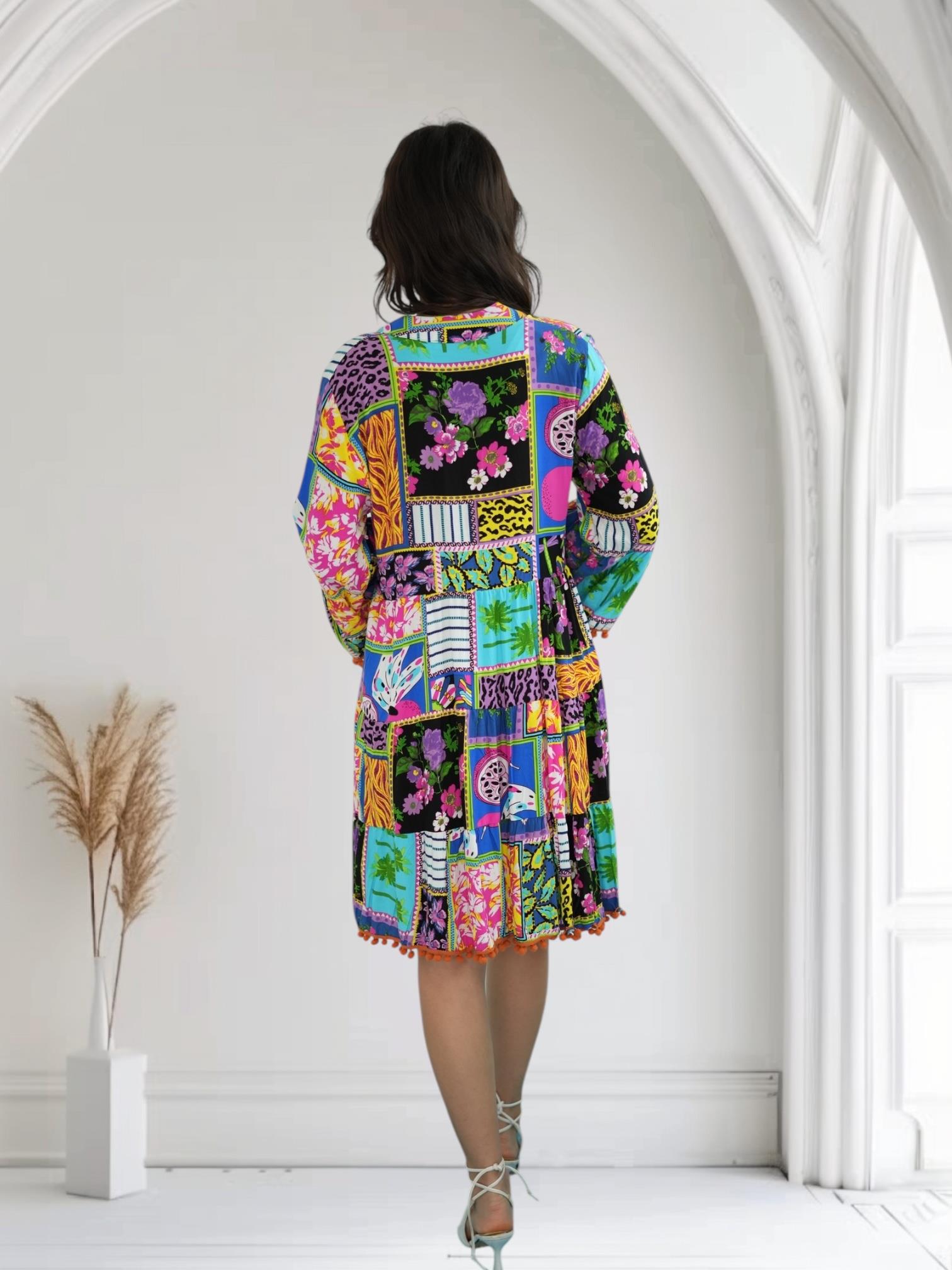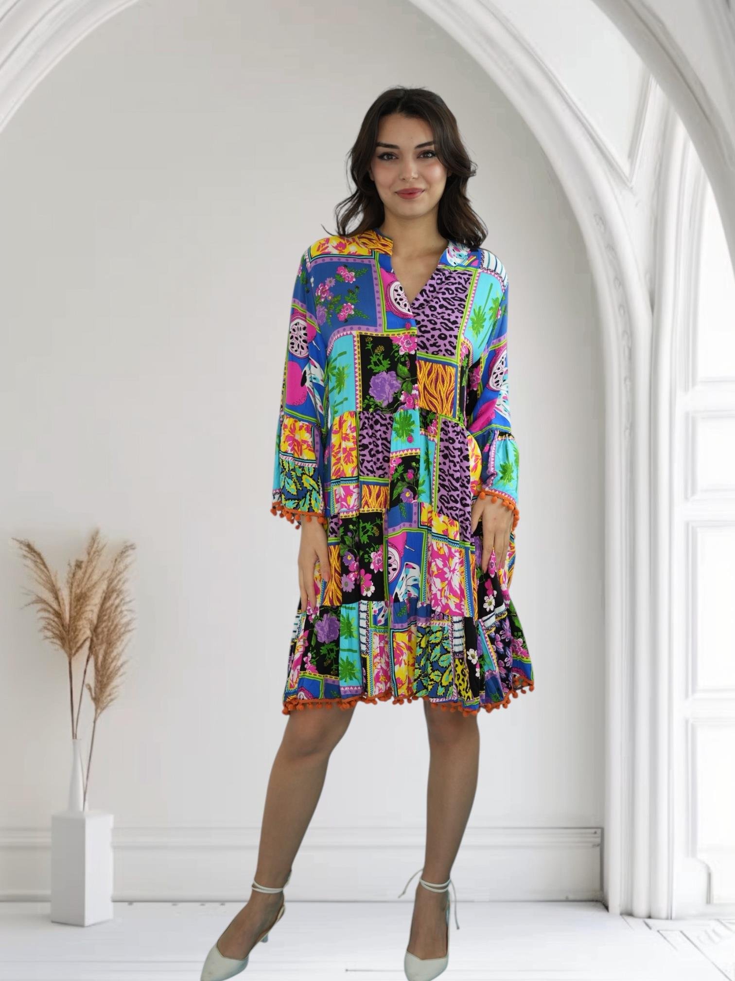 Mor Ponponlu Kısa Elbise