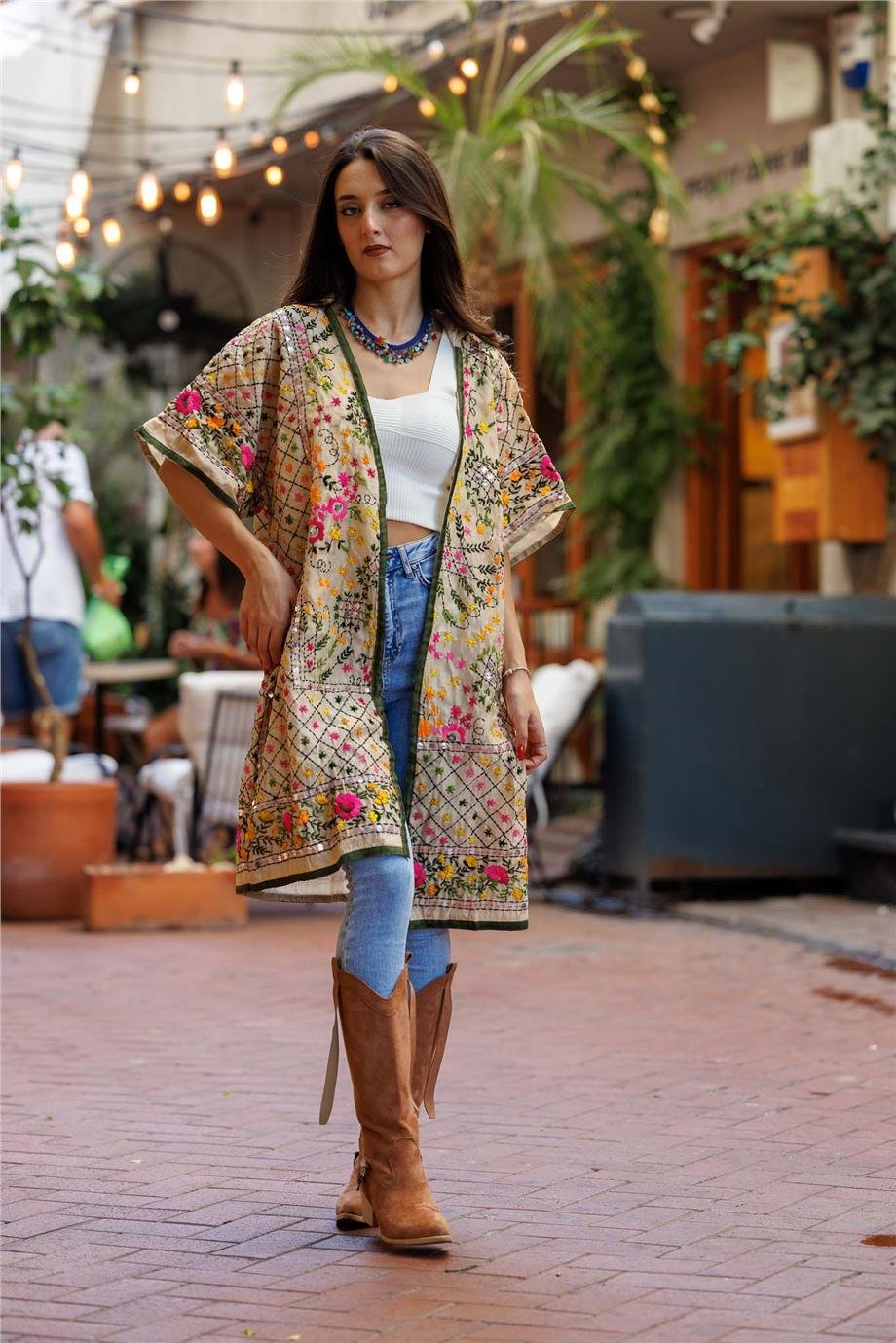 🌞🌻 Sarı Renk El İşlemeli Etnik Desenli Bohem Kimono