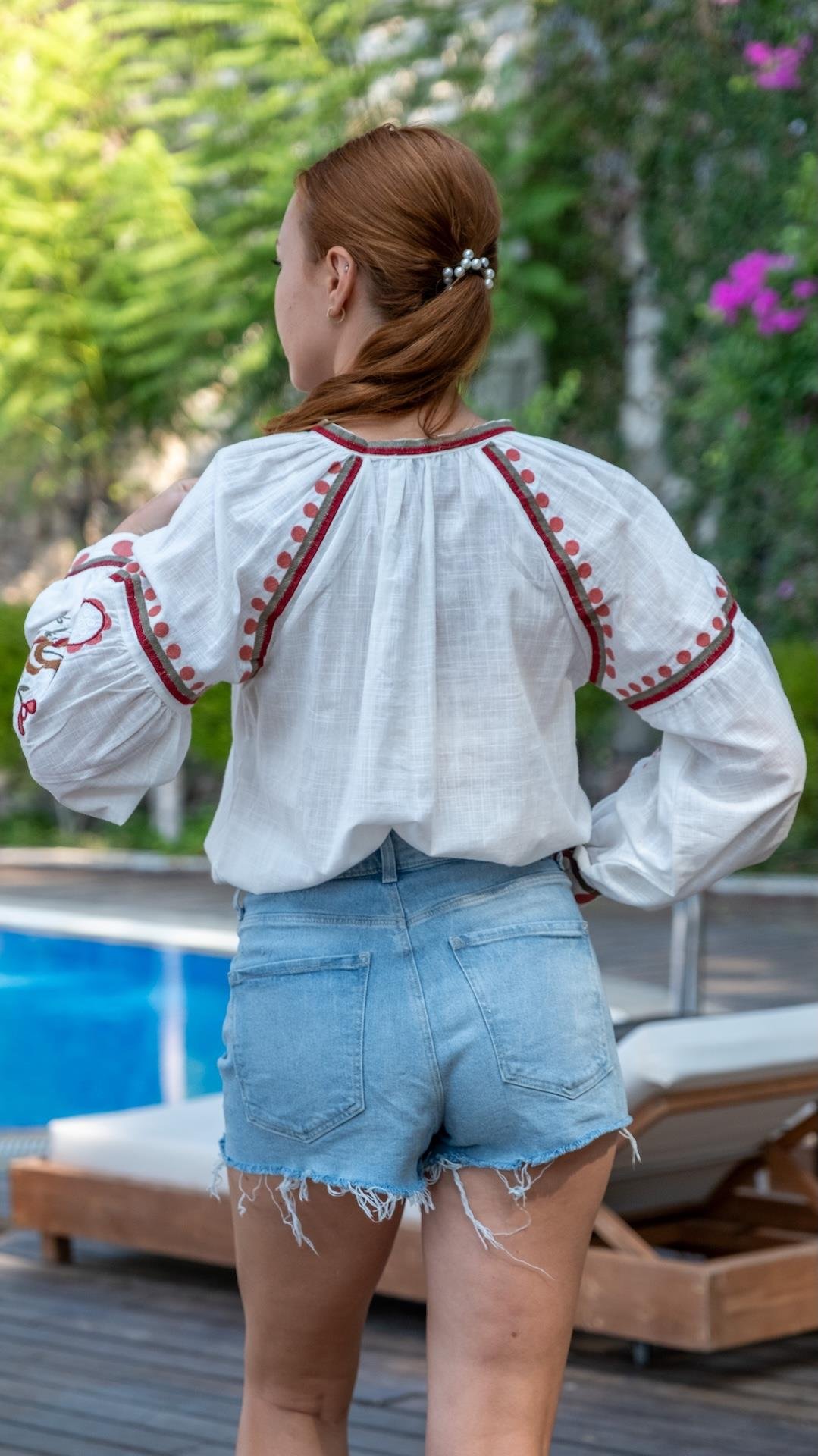 Tasarım Beyaz Balon Kol Çiçek Nakışlı Bluz (1092)