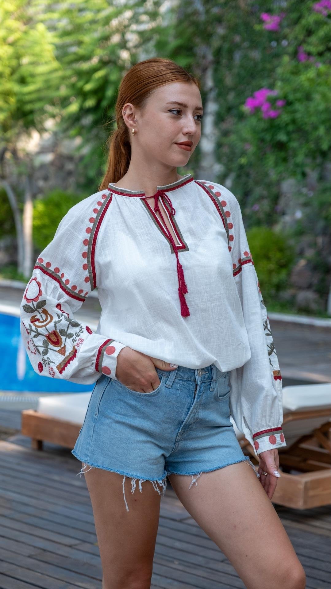 Tasarım Beyaz Balon Kol Çiçek Nakışlı Bluz