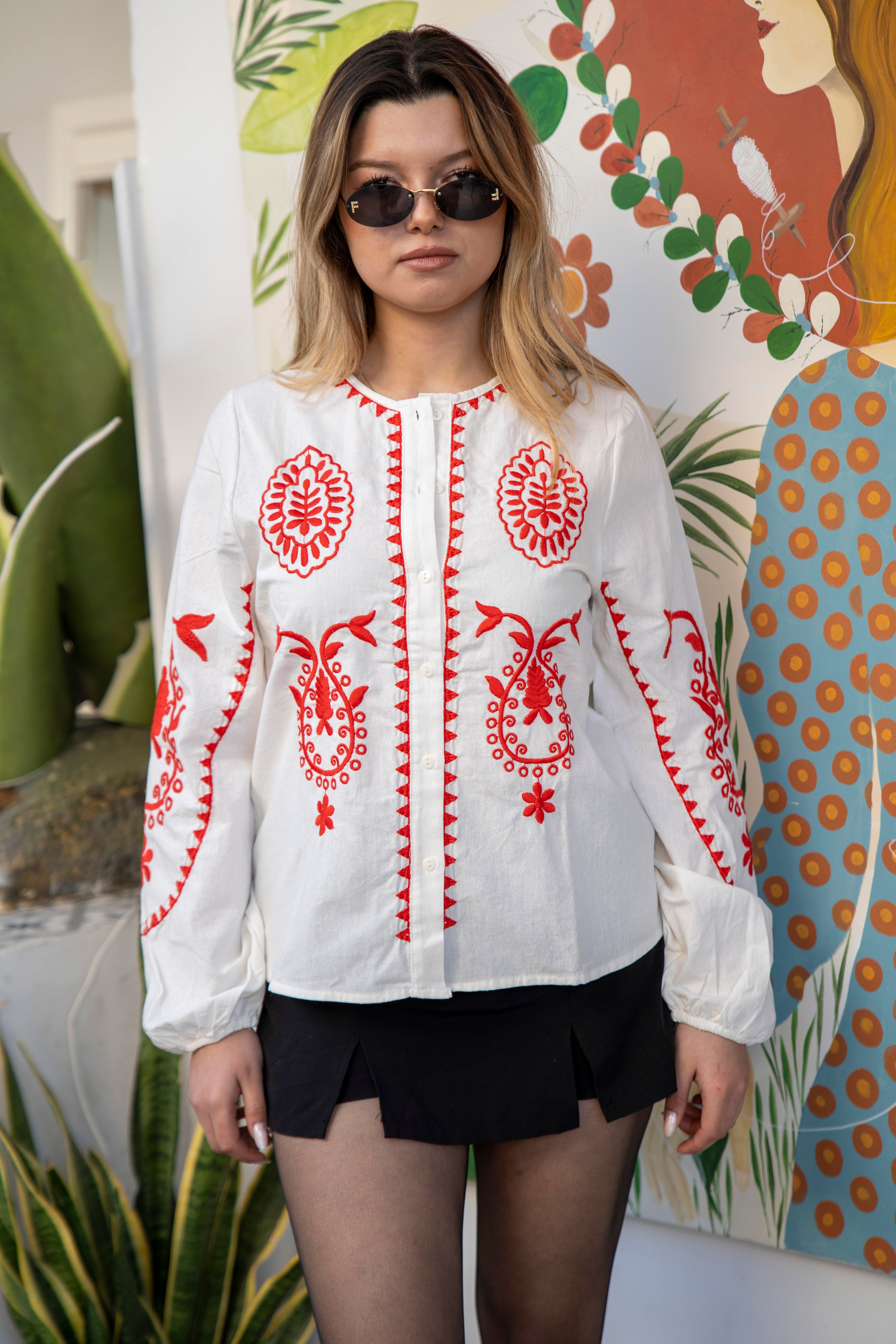 White Design Shirt with Red Embroidery